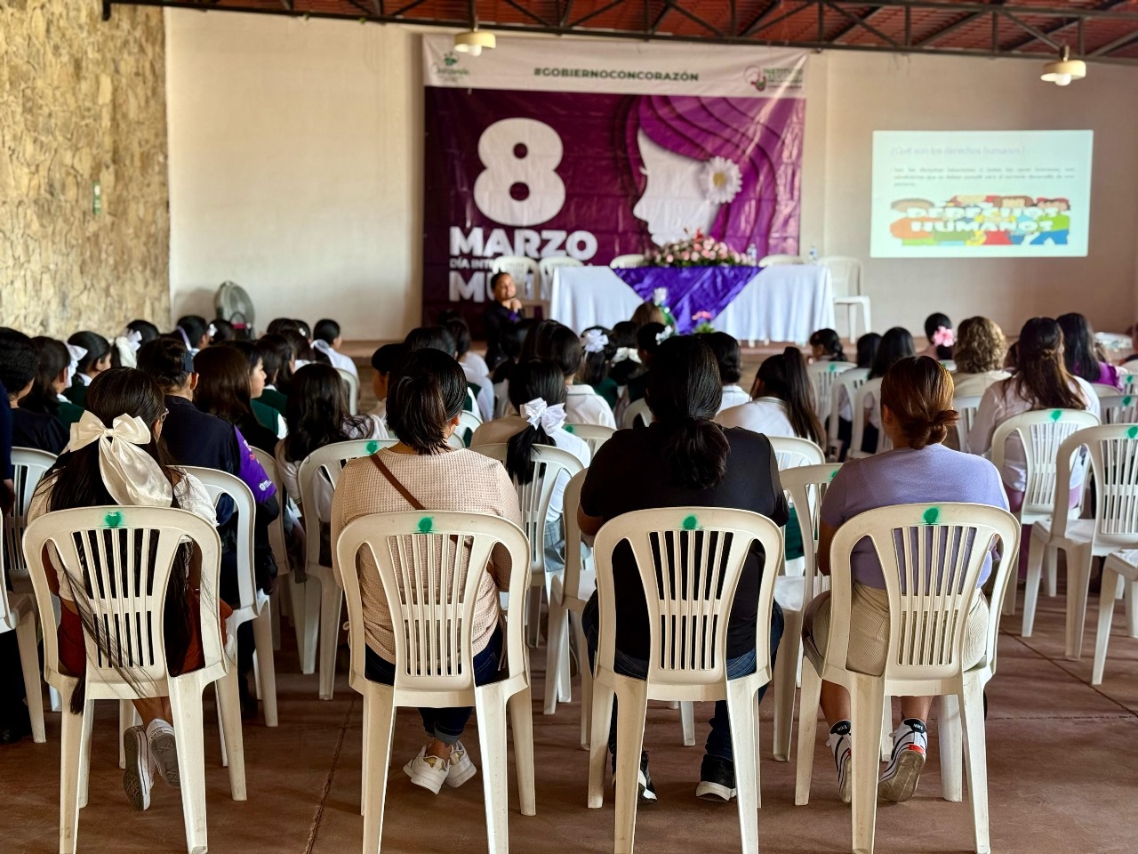 Desarrollo del Tema: Durante la charla se explicó al alumnado la diferencia entre conmemoración y festejo, y se les pidió que hicieran mención sobre los derechos humanos con que cuentan las mujeres y se les preguntó porque creían que se necesita especificar los derechos humanos de las mujeres.